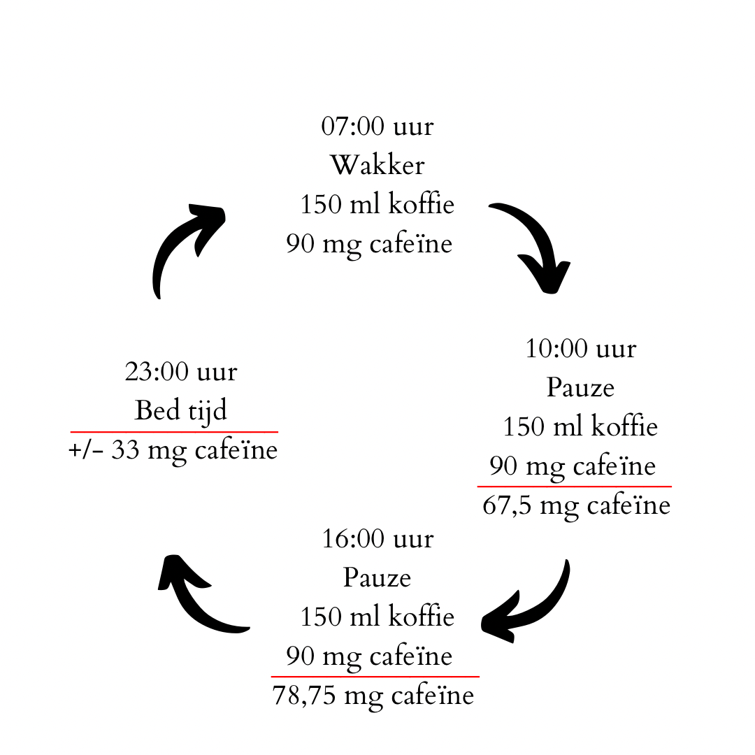 De halfwaarde van cafeïne is namelijk 6 uur en de kwartwaarde is 12 uur. Dat betekent dat er van 40 mg cafeïne na 6 uur nog 20 mg over is en na 12 uur nog 10 mg. Wanneer je dus vanaf dat je wakker bent tot 10:00 uur 's ochtends 4 kopjes koffie hebt gedronken, is dat hetzelfde als een kop koffie drinken en dan gaan slapen.
