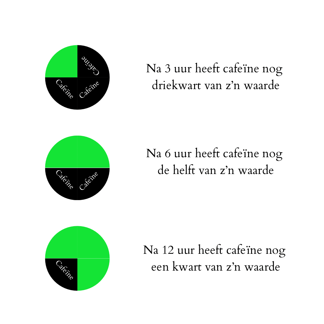 De halfwaarde van cafeïne is namelijk 6 uur en de kwartwaarde is 12 uur. Dat betekent dat er van 40 mg cafeïne na 6 uur nog 20 mg over is en na 12 uur nog 10 mg. Wanneer je dus vanaf dat je wakker bent tot 10:00 uur 's ochtends 4 kopjes koffie hebt gedronken, is dat hetzelfde als een kop koffie drinken en dan gaan slapen.